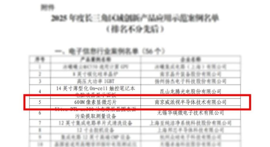 近日,上海市经信委、江苏省工信厅、浙江省工信厅、安徽省工信厅联合发布了《2025年度长三角区域创新产品应用示范案例名单》,威派视自主研发的“600M像素显微芯片”成功入选“电子信息行业”创新产品应用示范案例名单。
