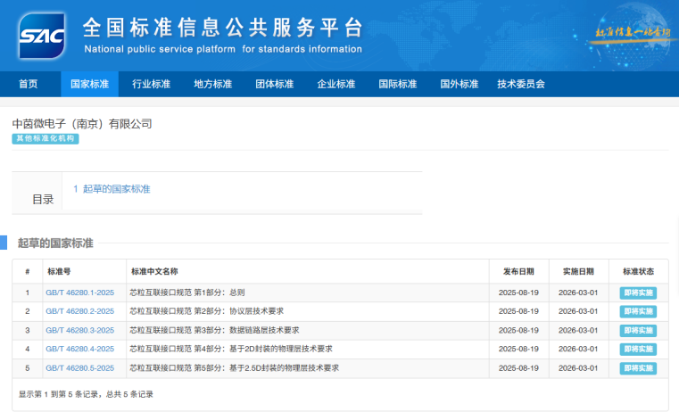 近日,国家市场监督管理总局(国家标准化管理委员会)正式发布《芯粒互联接口规范》系列5项推荐性国家标准,该标准为中茵微电子参与编制,将于2026年3月1日正式实施。这是我国集成电路芯粒领域的首批国家标准,标志着芯粒标准化建设取得里程碑式突破。