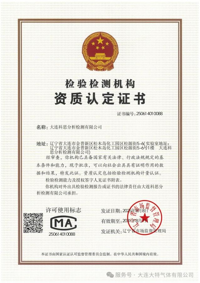 近日,大连大特子公司——大连科思分析检测有限公司成功通过检验检测机构资质认定(CMA认证),正式获得国家认可的第三方检测资质。CMA资质的取得,表明公司已在检测设备、技术团队、质量管理等方面全面符合国家标准。