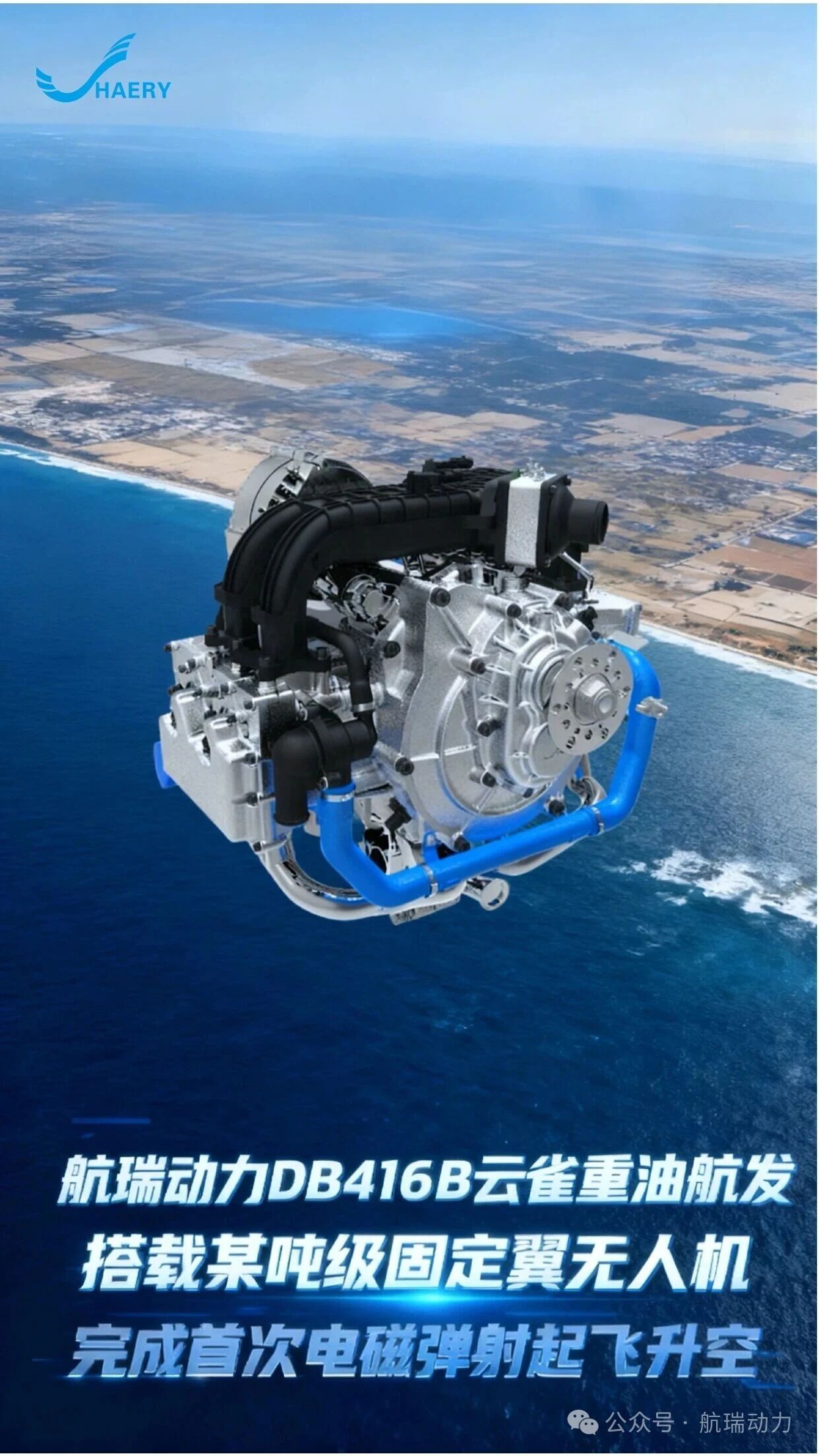 航瑞动力日前发布消息,其自主研发的DB416B“云雀”重油航空发动机,搭载某吨级固定翼无人机,首次完成电磁弹射起飞升空。