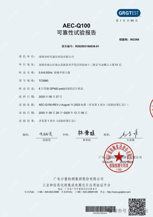 No.3 时代速信TC5985低噪声放大器通过AEC-Q100车规认证